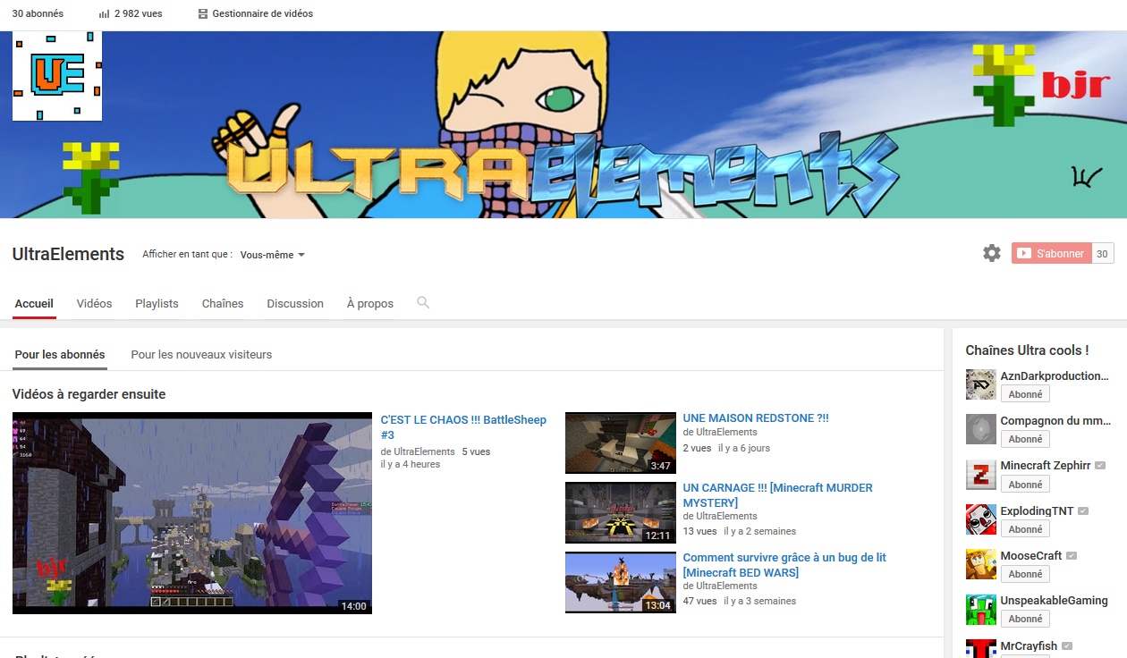 Certains d'entre vous connaissent sans doute déjà ma chaîne Youtube UltraElements, étant donné qu'ils ont accédé au site à partir de cette dernière. Mais pour ceux qui auraient trouvé mon site par hasard, et bien je vous conseille d'aller voir ma chaîne pour des tutos redstone ou des vidéos gaming ! Si le contenu de ma chaîne vous plaît, n'hésitez pas à vous abonner, à liker mes vidéos et aussi à les commenter si jamais vous avez des idées de vidéos que je pourrai faire. Pendant les vacances, j'essaye de poster une vidéo par semaine, alors restez à l'affût des nouveautés ;)